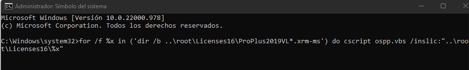 3. Luego, ejecuta el siguiente comando para convertir tu versión Retail a VL (Licencia por Volumen).